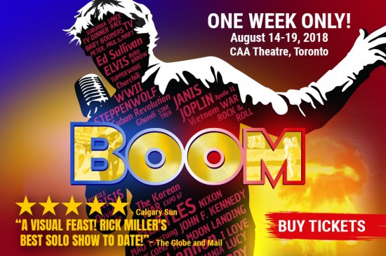 From mirvish.com: "The return engagement of the most presented new play in Canada hits the stage of the CAA Theatre, August 14 to 19, 2018. Written, directed and performed by Rick Miller, BOOM is an explosive solo performance that documents the music, culture and politics that shaped the Baby Boomers (1945-1969). BOOM takes us through 25 turbulent years, and gives voice to over a 100 influential politicians, activists and musicians. It's a mind-blowing experience for audiences of all generations."